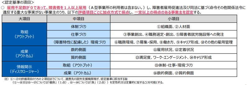 「共に進む」に由来し、2020年4月に創設された同認定は、300人以下の中小企業を対象に、「取組(アウトプット)」「成果(アウトカム)」「情報開示(ディスクロージャー)」の3つの観点から計17の評価基準に沿って総合加点方式で評価(表)。25年6月時点で計545事業主(うち特例子会社131事業主)が認定を受けている。
