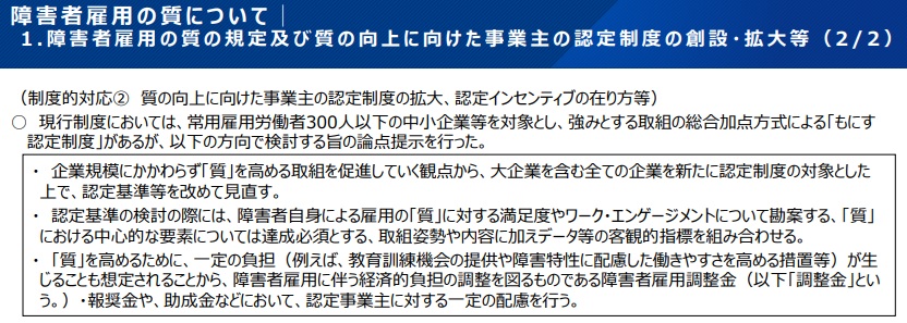 障害者雇用に積極的な中小事業主を認証し、マーク使用による広報効果や低利融資などのメリットを受けられる「もにす認定」。現在議論を進めている厚生労働省の研究会は、障害者雇用の「質」向上の観点で、大企業にも認定対象を拡大する方針を示している。