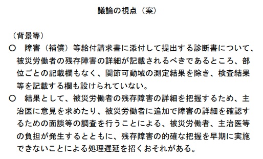 障害補償等給付などの請求は、主治医が記載した診断書を請求書に添付して提出する必要がある。ただ現行の診断書は詳細が書き込めず、労働基準監督署による主治医への意見聴取、被災労働者への確認の面談といった追加的な事務負担が発生。迅速な労災認定事務に支障を及ぼす可能性を鑑み、部位ごとの残存障害や詳細な検査結果を記載できるように診断書様式を改める