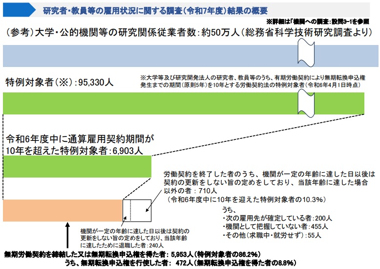 10年特例の対象となる研究者・教員に実施した雇用に関する調査では、2024年度中に通算雇用期間10年超となった6903人の5月1日時点の状況を把握した。うち無期労働契約を締結したのは598人と1割に満たず、950人が労働契約を終了し、5355人が有期労働契約を継続。さらに労働契約を終了した者の74・7%は定年退職以外の者で、有期契約労働を継続した者のうちの8.8%は実際に申込み権を行使していた。
