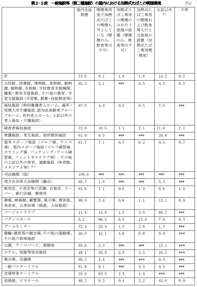飲食店など第二種施設の屋内全面禁煙率は火をつけるたばこで同0.9㌽増の74.6%、加熱式たばこで同0.3㌽増の73.6%。うち「事務所、工場――等」も順に同1.8㌽増の72.4%、同0.4㌽増の70.8%と上昇し、受動喫煙対策の進展を示唆した。