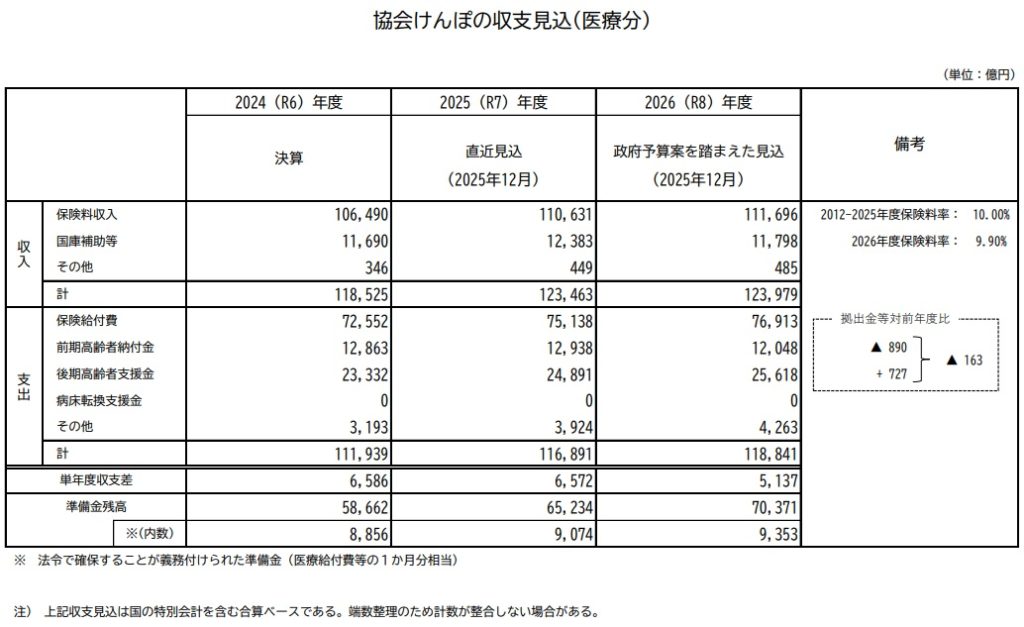 全国健康保険協会はこのほど、予算案を踏まえた2026年度の収支見込みを公表した。