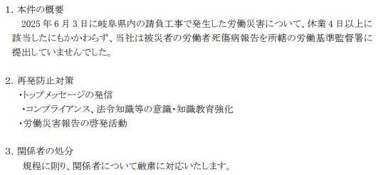 昨年6月に岐阜県内の請負工事で発生した作業員の休業4日以上の労働災害を、労働基準監督署に報告しなかった。いわゆる労災隠しに当たり、同社は関係者を厳正に対処するとともに再発防止を徹底するとしている。