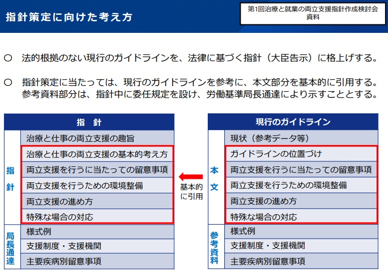 労働施策総合推進法の4月改正での努力義務化に伴い、検討会が治療と就業の両立支援指針案を作成。現行のガイドラインを法定指針に格上げした形で、改正法の施行と同時に適用して必要な行政指導に着手する。