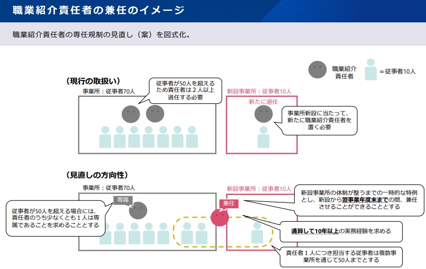 有料職業紹介事業者が事業所を新設する場合に限り、他の既存の職業紹介責任者による当該事業年度の翌年度末までの兼任を容認。兼任を可能とする要件として、「職業紹介責任者として実務経験が通算10年以上」を求めるなど規制の緩和は限定的にとどめた。