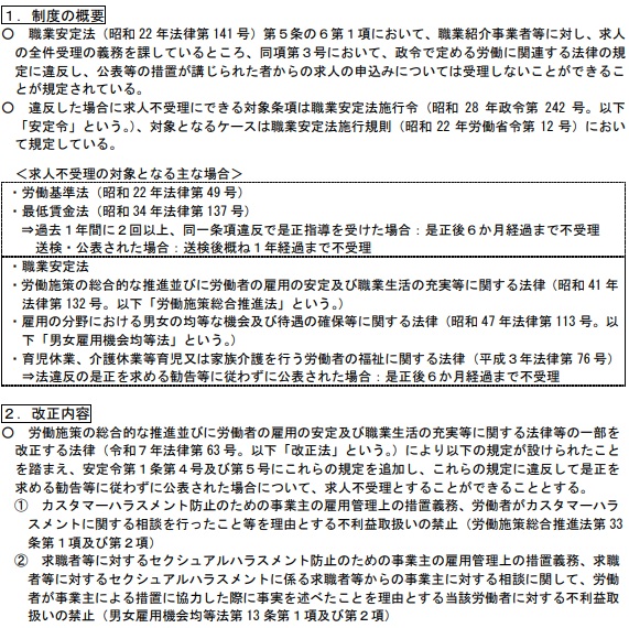 厚生労働省はこのほど、公共職業安定所や職業紹介事業者などが求人申込みを受理しない範囲の拡大を決めた。