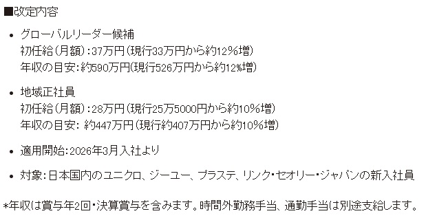 ファーストリテイリンググループ(山口県山口市)は、世界で通用する競争力と成長力を強化するため、日本の新卒社員の初任給を3月に改定した。報酬を拡充することで、グローバル水準の採用と育成を加速。グローバルリーダー候補は37万円、地域正社員は28万円と従前から順に4万円、2万5千円引き上げた。