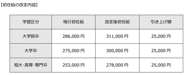このほか、松屋フーズホールディングス(東京都武蔵野市)が大学卒で現行比5千円増の27万円、東北電力と東北電力ネットワーク(宮城県仙台市)が大学卒で同1万1千円増の25万3千円、菓子製造の春華堂(静岡県浜松市)が大学卒総合職で同3万円増の25万円に増額する。