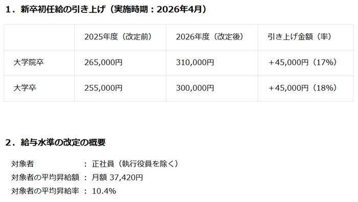 空調・衛生設備工事の大成温調(東京都品川区)は26年4月入社の初任給を、一律で2万5千円引き上げる。建設設備業界全体が抱える慢性的な人手不足と、急激な物価上昇を踏まえ、改定後の初任給は大学院卒が31万1千円、大学卒が30万円、短大・高専・専門卒が27万8千円とする。