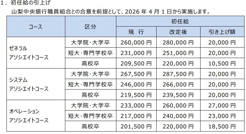 山梨中央銀行(山梨県甲府市)は、26年4月入社の初任給を最大で2万7千円引き上げる。大学院卒・大学卒の改定後の初任給は「システムアソシエイトコース」で28万7500円、「ゼネラルアソシエイトコース」で28万円、「オペレーションアソシエイトコース」で26万円となる。