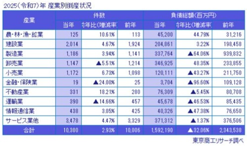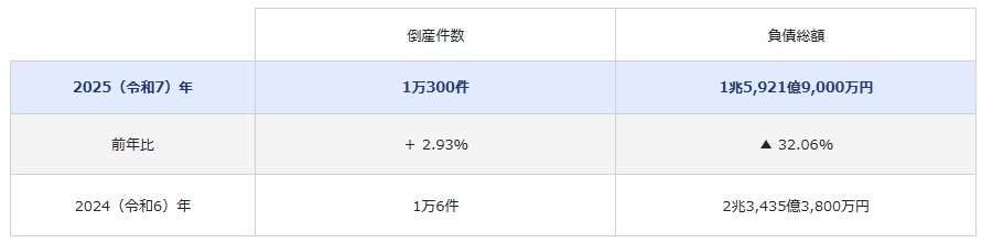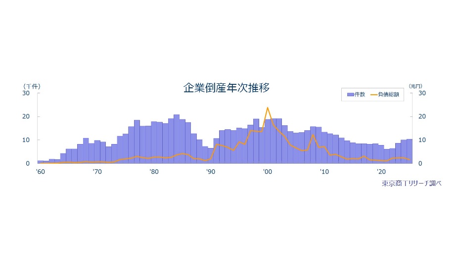 東京商工リサーチはこのほど、2025年に全国で発生した負債総額1000万円以上の企業倒産が前年比2.9%増の1万300件と4年連続で増加したと発表した。増加幅こそ縮小傾向にあるが、2年連続で1万件の大台を突破した。