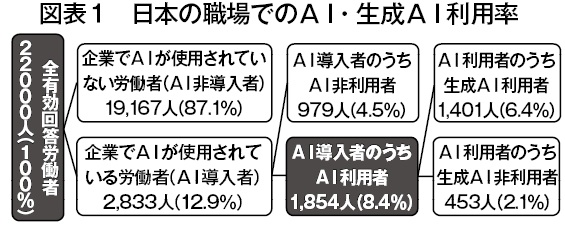 日本において、企業でAIが使用されている労働者(AI導入者)の割合は全体の12.9%、うちAI利用者は8.4%、さらに生成AI利用者は6.4%(図表1)だった。国際比較可能な金融・保険業と製造業では、8カ国中最低水準となった。