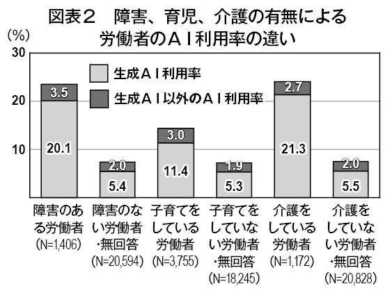 一方、障害を持つ労働者の生成AI利用率は20.1%、同じく育児従事者は11.4%、介護従事者は21.3%と、それ以外の労働者の利用率の5.3~5.5%を大幅に上回った(図表2)。