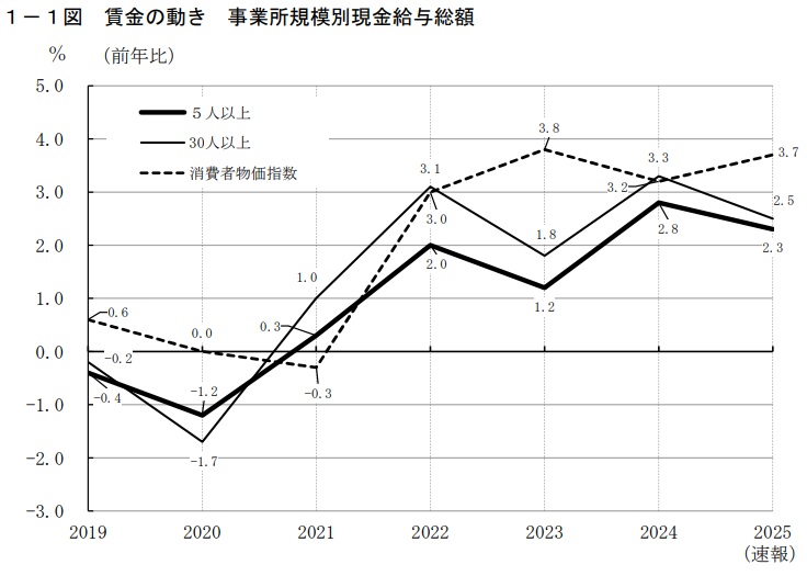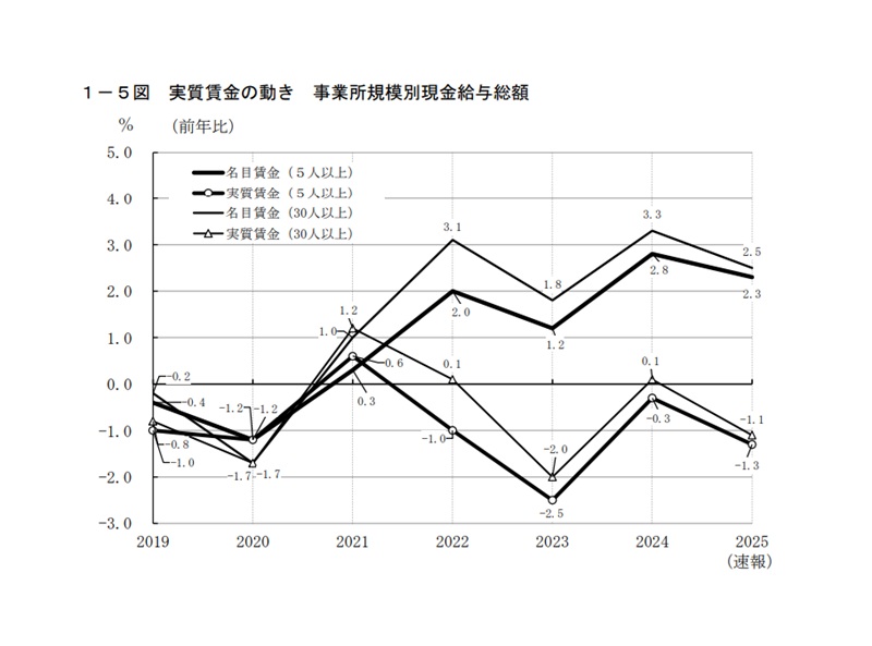 厚生労働省がこのほど発表した毎月勤労統計調査の速報値で、2025年平均の実質賃金が5人以上規模の現金給与総額で前年比1.3%減となった。低下幅は24年平均の同0.3㌽減から拡大し、4年連続でマイナスを記録した。