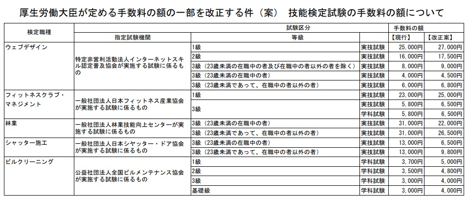 厚生労働省は告示の改正で、指定試験機関の行う技能検定試験の手数料の額を4月から見直す考えだ。