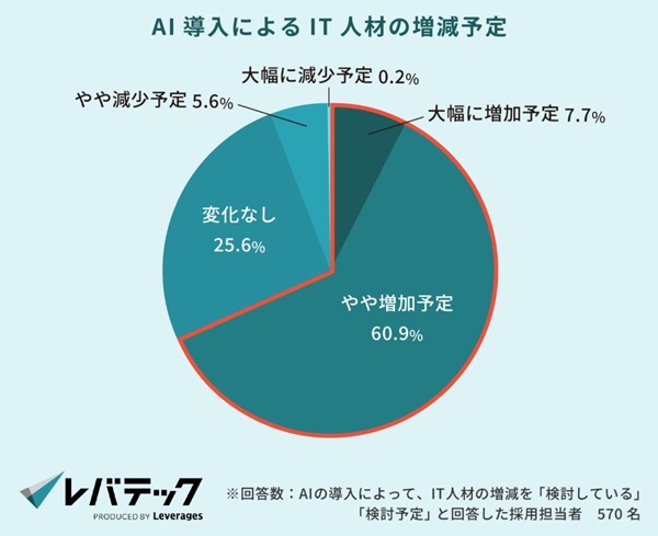 レバテックがこのほど発表した「IT人材白書2026」で、AIの導入効果を踏まえたIT人材の採用数の検討に関して68.6%の企業が「増員予定」と回答し、「減員予定」の5.8%を大きく上回った。AI導入による黒字リストラの増加が懸念されるなか、IT人材のニーズは底堅く、むしろ採用が活発なことを裏づけた。