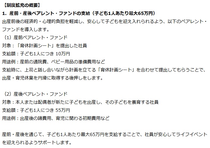 まず出産前に上司と作成した育休計画シートを提出した場合に、準備費用として子ども1人10万円を支給する産前ペアレント・ファンドを導入する。また本人や配偶者が子どもを出産し、養育する社員に対しては出産後の多様な出費を想定して、子ども1人55万円の産後ペアレント・ファンドを支給。支給額は子ども1人につき、最大で65万円に達する。