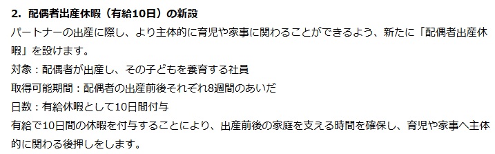 さらにパートナーの出産に当たり主体的に育児・家事に取り組めるように、配偶者出産休暇を新設。配偶者の出産前後各8週間に、10日間の有給休暇の取得を可能にする。