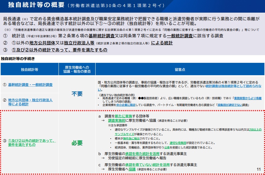 局長通達する2統計で示す職種と派遣労働者の業務が乖離する場合は、法定する基幹統計、地方公共団体の統計などのほか、要件を満たす独自統計も利用できる。