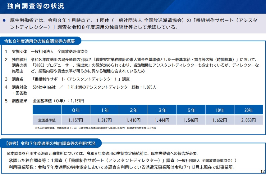 厚労省は、1年未満のアシスタントディレクター1075人に行った全国放送派遣協会の「番組制作サポート」調査1件を承認。全国基準値の0年の時給は1157円で、25年末時点で派遣元82事業所の利用を確認している。