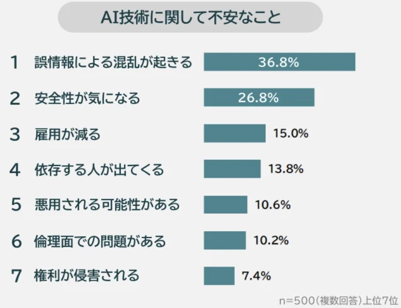 発展を止めても規制すべき理由では「悪用を防ぎたい」、ある程度規制すべき理由では「ルールの下で発展させたい」が最多。AI技術に関する不安は、「誤情報による混乱が起きる」が36.8%で最も多い。