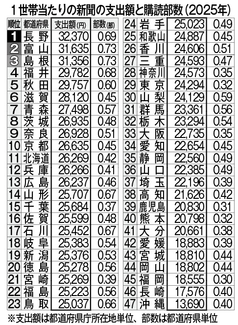 総務省はこのほど、2025年の家計調査の結果を公表した。2人以上世帯の新聞への支出額は、全国平均で前年比524円減の2万4397円だった。都道府県庁所在地で支出額が多いのは順に長野市が同296円増の3万2370円、富山市が同5395円増の3万1635円、松江市が同1467円増の3万1356円となっている。