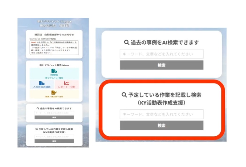 建設業災害防止協会(東京都港区)では、災害に繋がるようなヒヤリとした体験について、作業負荷や心身の状況など人が関わる要因にも着目した「新ヒヤリハット報告」を推奨している。同協会の山梨県支部では、過去3年間で報告のあった約3000件の事例について、AIを活用してその場で検索できるシステムを開発。検索ワードに応じて類似事例のサマリーや、成功体験をまとめた「グッドリカバリー事例集」の活用に役立てている。