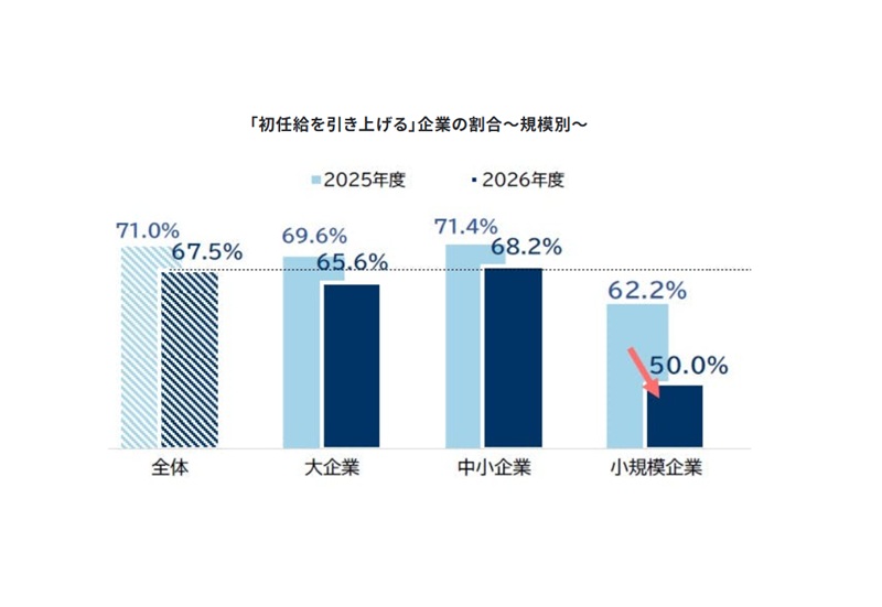 帝国データバンクの調査によると、2026年4月入社の新卒社員の初任給を「前年度から引き上げる」企業割合は67.5%で、前年度比3.5㌽減と低下した。世代間の不公平感の高まりを鑑み、人件費を初任給だけでなく既存社員に対する賃上げに振り向ける動きがみてとれる。