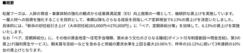 松屋フーズホールディングス(東京都武蔵野市)は4月の改定で、従業員満足度向上施策の一環として正社員の給与を10.06%引き上げる。賃上げ率は24年の10.90%、25年の10.12%に続き3年連続で二桁増を記録。定期昇給分とベースアップ分が6.13%を占め、残りは期末賞与の支給、住宅手当の増額、その他の福利厚生サービスの拡充による賃上げとなる。