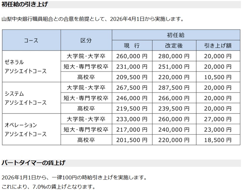 山梨中央銀行(山梨県甲府市)は1月に、パートタイマーの時給について一律100円の賃上げを実施。物価上昇への対応と職員のモチベーション向上が目的で、賃上げ率に換算すると7.0%の引上げとなった。