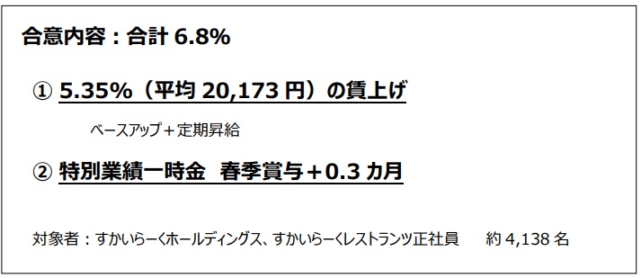 すかいらーくホールディングス(東京都武蔵野市)は26年春季交渉で、4年連続で満額回答することで合意。対象は4千人を超える正社員で、定昇分とベア分を足した5.35%に加え、0.3カ月分を特別業績一時金に上乗せすることで改定率は6.8%になる。