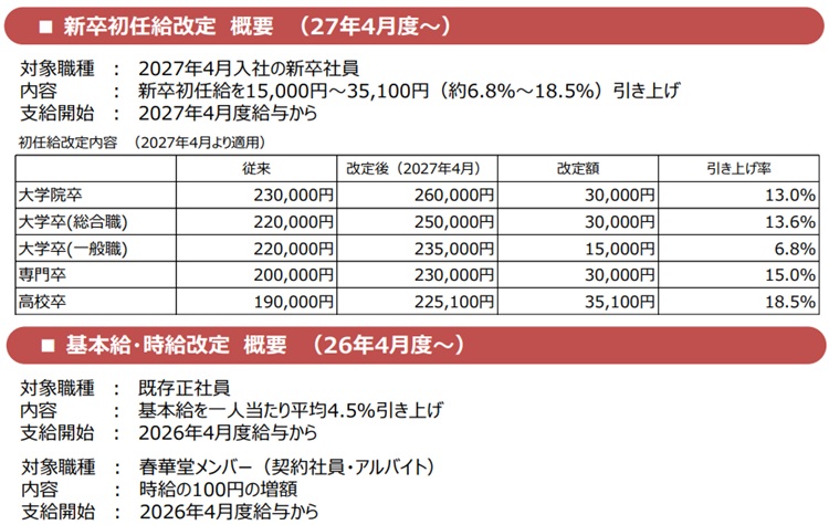 菓子製造の春華堂(静岡県浜松市)は4月度給与から、家計負担軽減を目的にベアを実施。既存社員は基本給を1人平均4.5%、契約社員とアルバイトは時給を100円増額する。