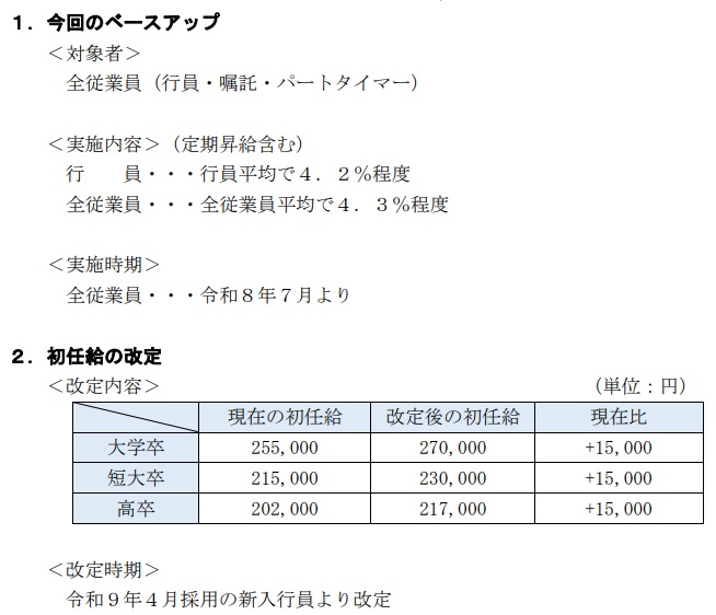 徳島大正銀行(徳島県徳島市)は、7月からベアを実施。定昇分と合わせた賃上げ率は行員が平均4.2%程度で、嘱託・パートタイマーを含む全従業員平均で4.3%程度となる。