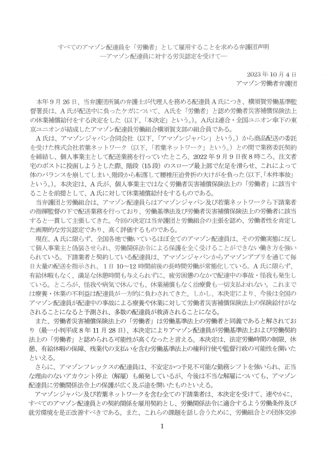 インターネット通販大手アマゾンジャパンの商品配達を行う個人事業主の配達中の負傷を横須賀労働基準監督署が労災認定したと、東京ユニオンなどが10月4日に明らかにした。個人事業主が「労働者」に該当すると9月26日付けで判断し、休業補償を給付。アマゾン配達員の労災認定は全国初とみられ、後続の同様の労災審査に影響を及ぼす可能性が出てきた。